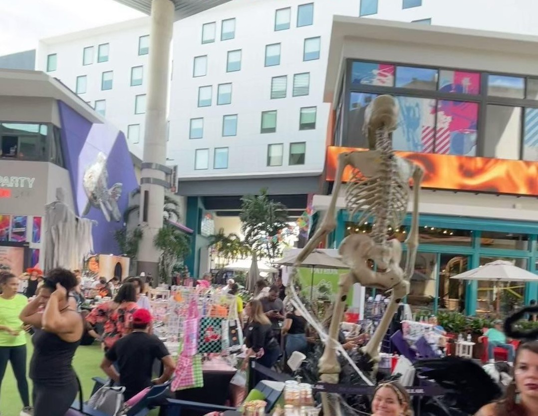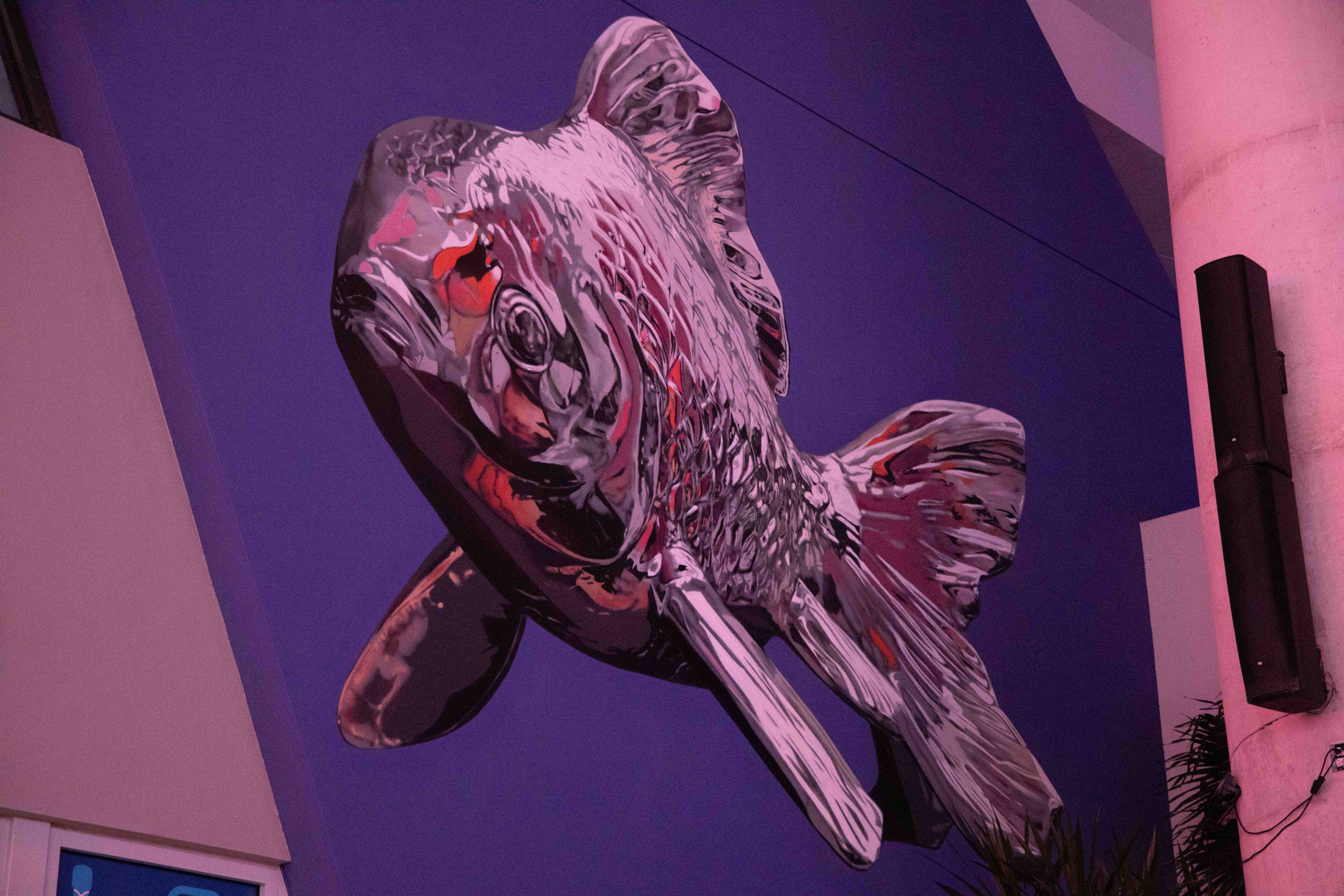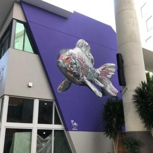 Also known as “Bik” or “Ismo”, Joshua Santos is a painter and muralist whose work has been internationally recognized and is identified by his toaster signature. His hyperrealistic, chromed graffiti mirror the surroundings where they are painted. This wall was especially selected by the artist to create the illusion that the enormous goldfish is dreamily swimming into the plaza.