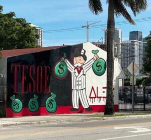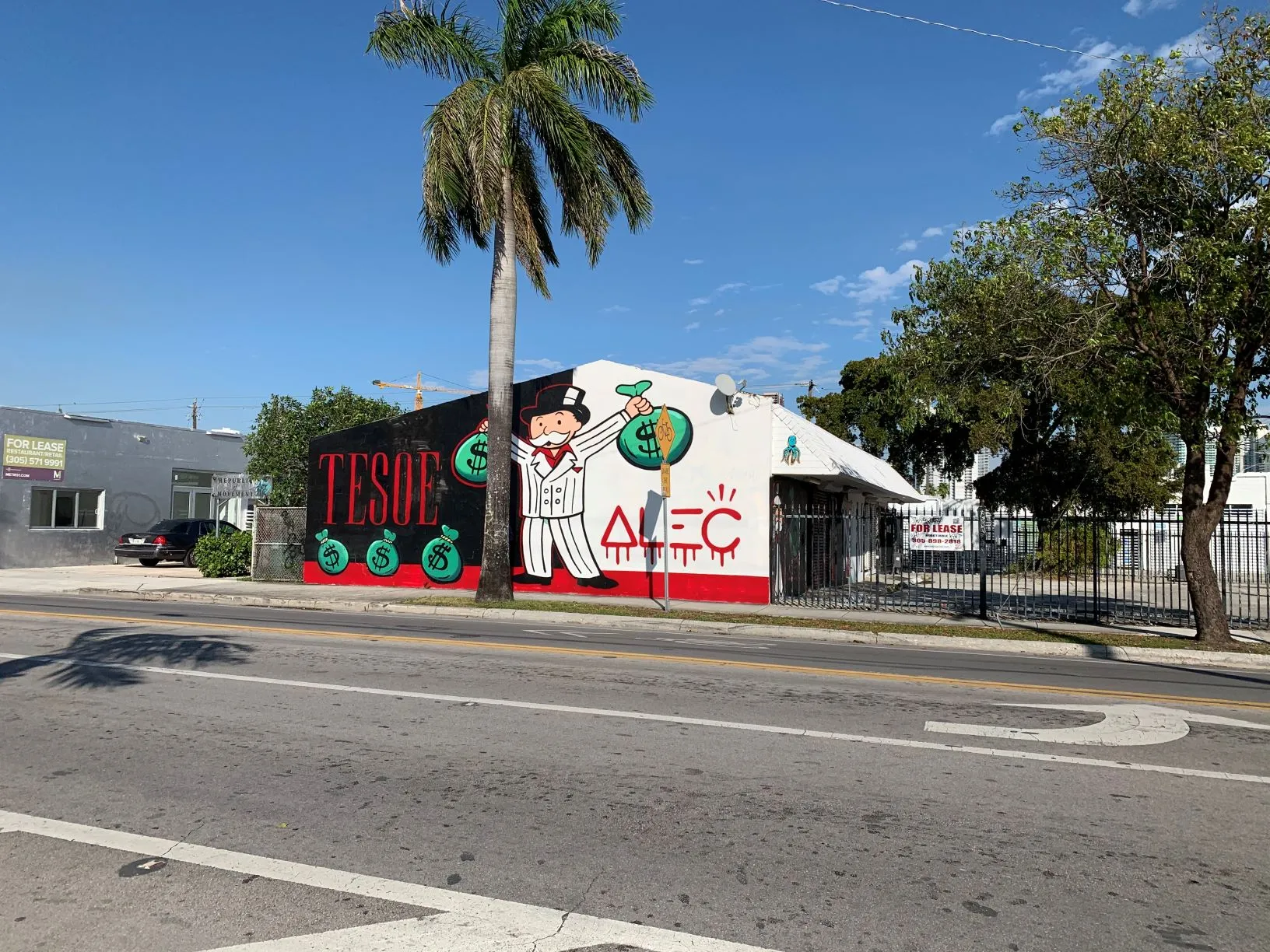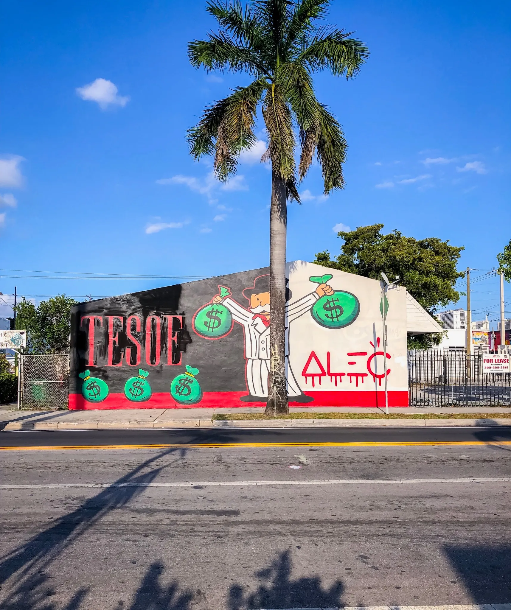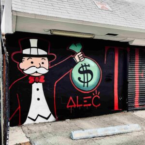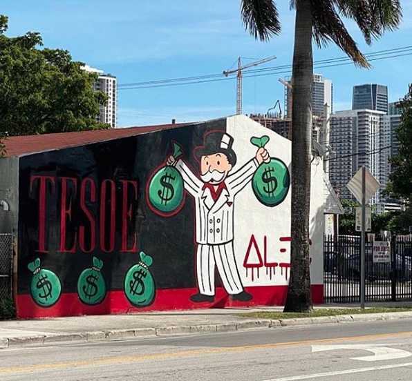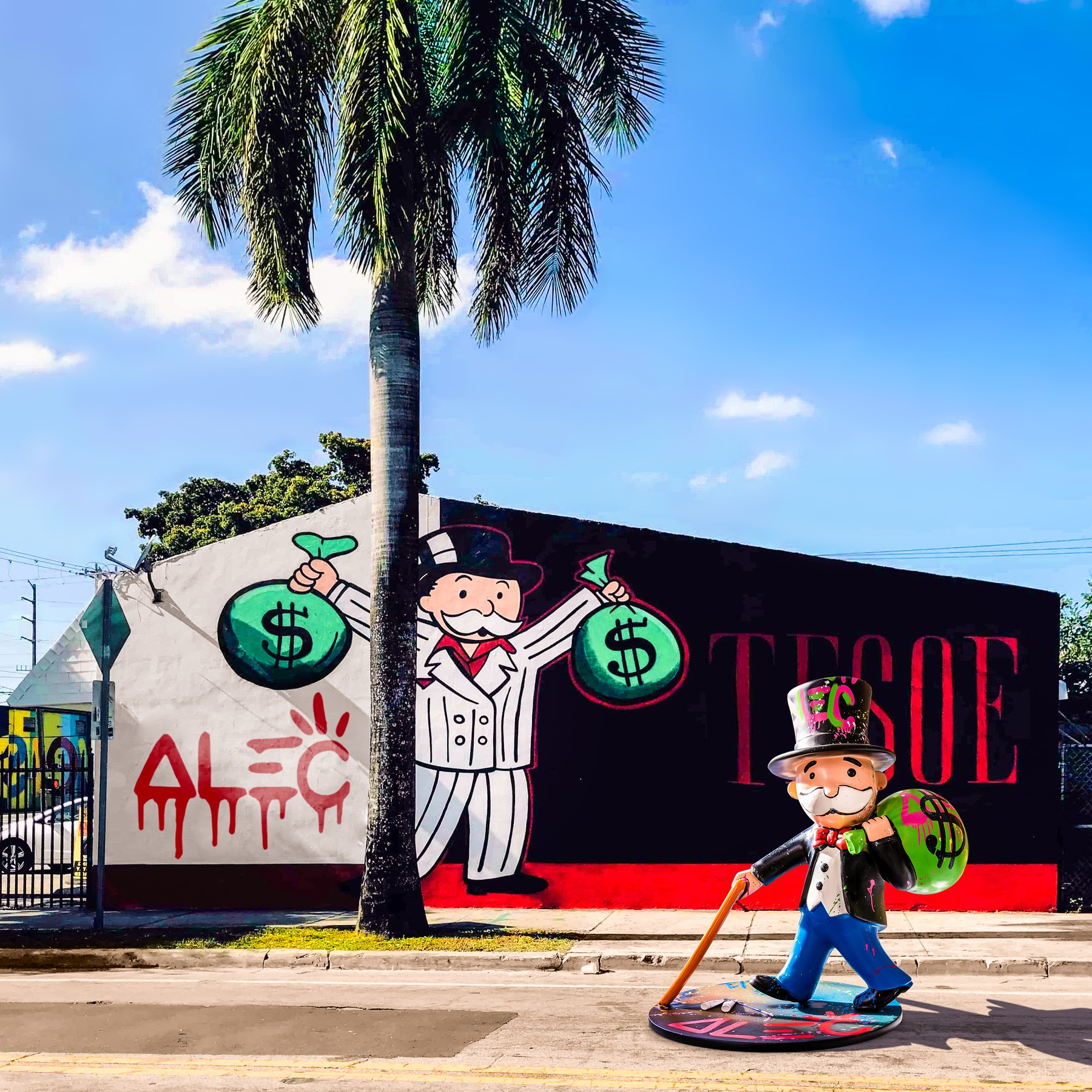 Alec Monopoly does his classic Mr. Monopoly dressed as Tony Montana from Scarface wearing a white pinstripe suit. This time TESOE signs in a with a red, serif, all caps style. Something new for a change. an intriguing layer to consider. Monopoly's collaboration with street artist T3SOE might shed light on his intent. Perhaps, this collaboration signifies a sense of vindication, a gesture of pardon, or a symbolic rite of passage, allowing Monopoly's characters to blend into the streets.